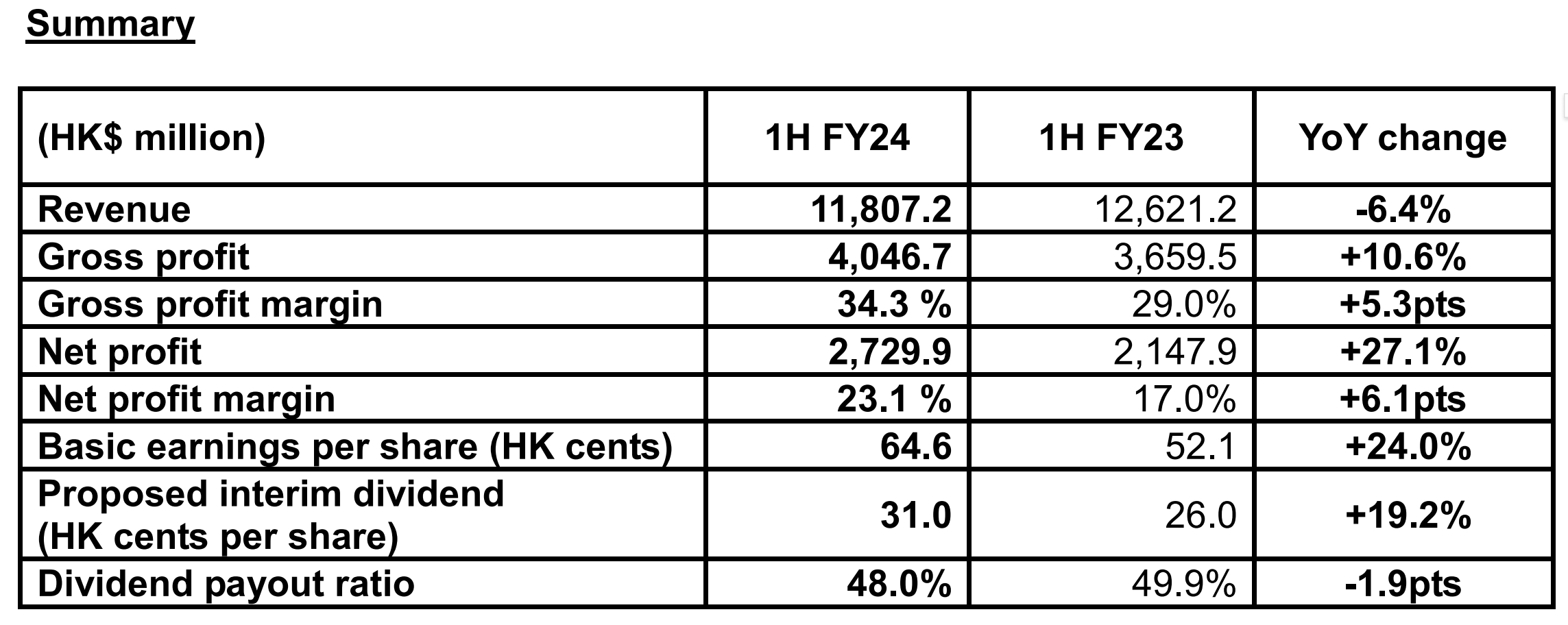 The Group’s financial position remained sound, with bank borrowings further reduced by 13.1 % from the end of 2023, and the net debt gearing ratio remained at a healthy level of only 15.2 %. The Board of Directors declared an interim dividend of HK 31.0 cents per share (1H FY23: HK 26.0 cents), representing a dividend payout ratio of 48.0%.